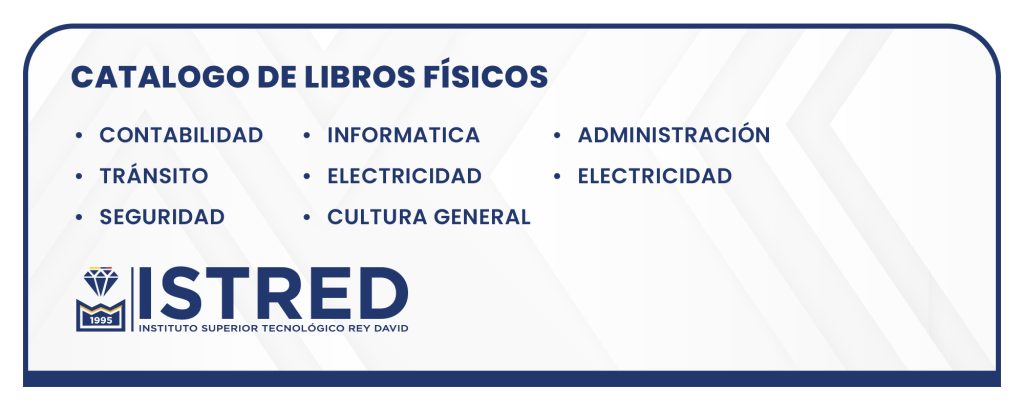 La Biblioteca del Instituto Superior Tecnológico Rey David, ubicada en el Campus «El Tintal» del ISTRED, Km. 51 Daule – Santa Lucía., cuenta con una gran variedad de libros actualizados y especializados en las áreas de estudio de las carreras que oferta la Institución, su infraestructura física le permite al consultante encontrar una área de estudio y asesoría para realizar consultas y tareas, el área esta diseñada para brindar comodidad y tranquilidad al estudiante, lo cual garantiza una mayor capacidad en el área de aprendizaje y concentración de estudiante que hace uso de la biblioteca.