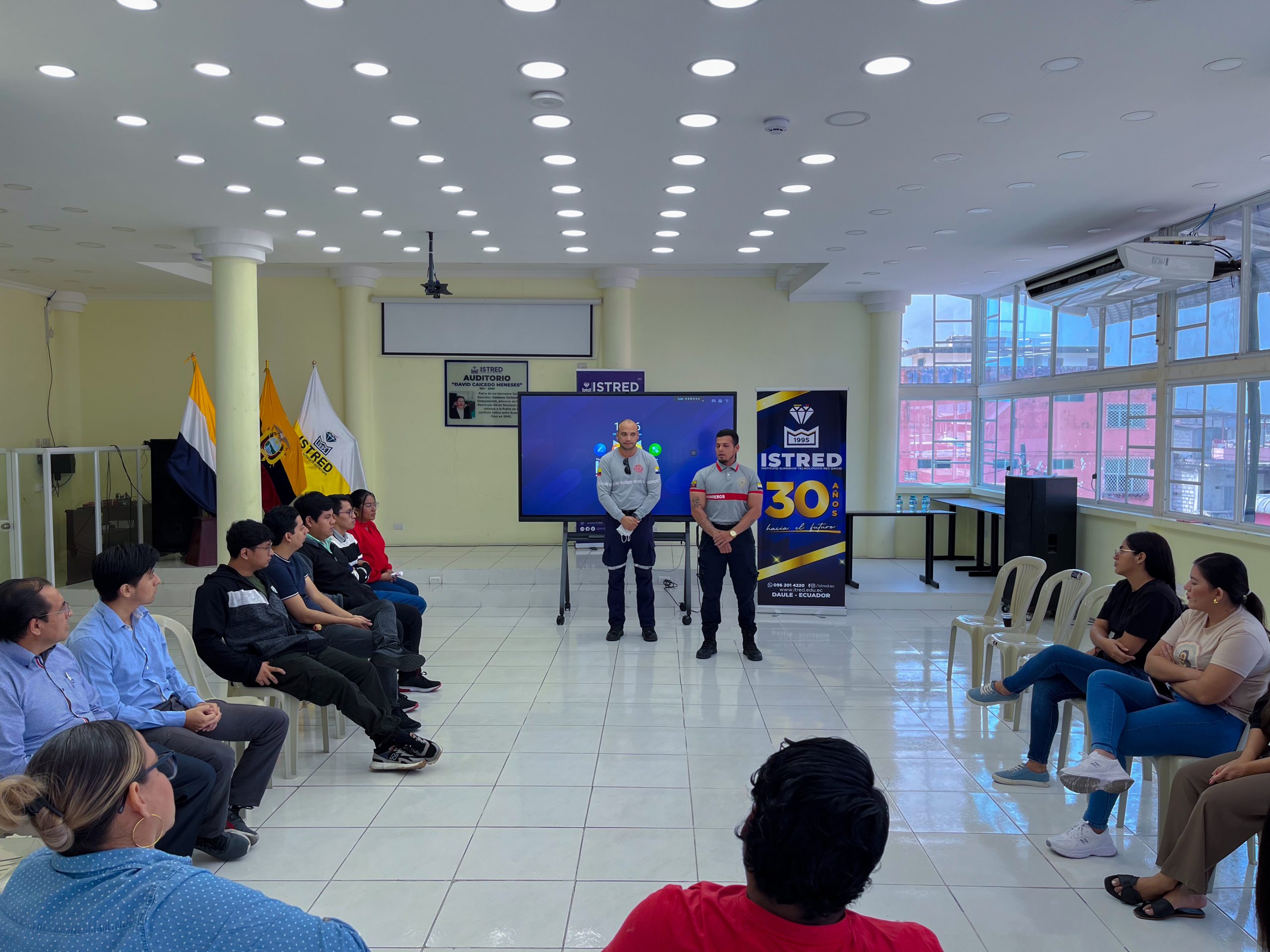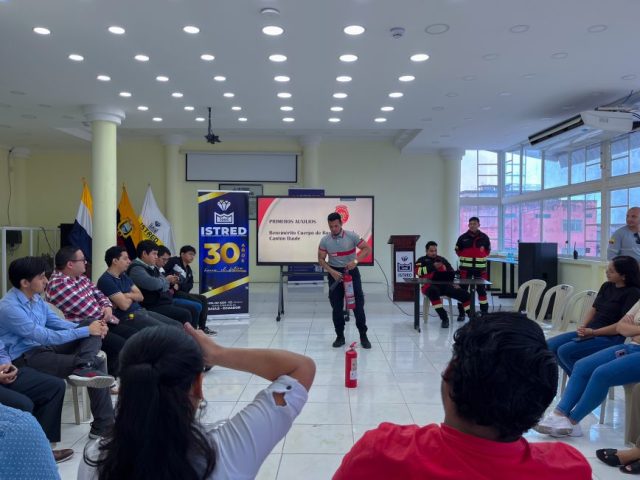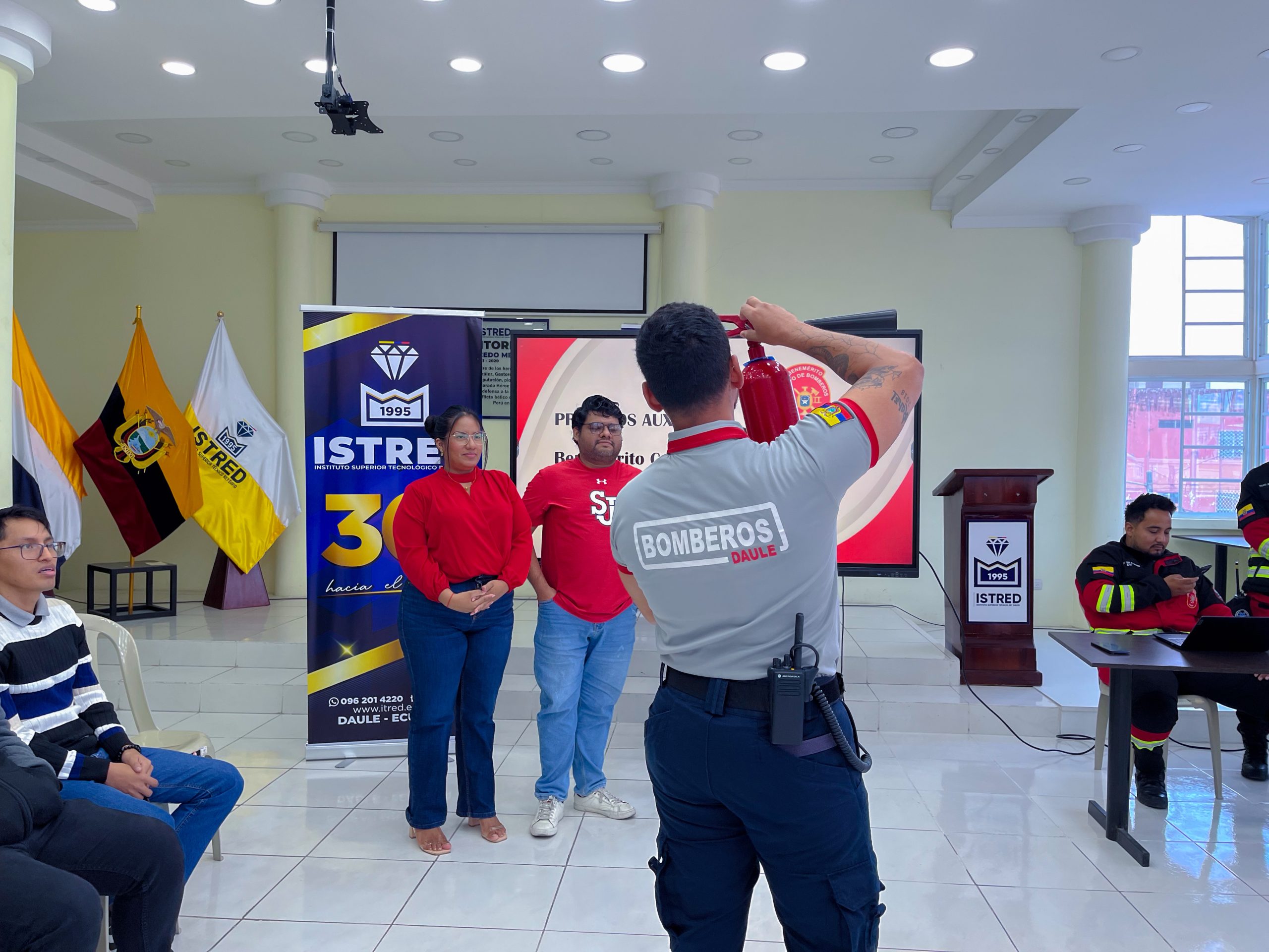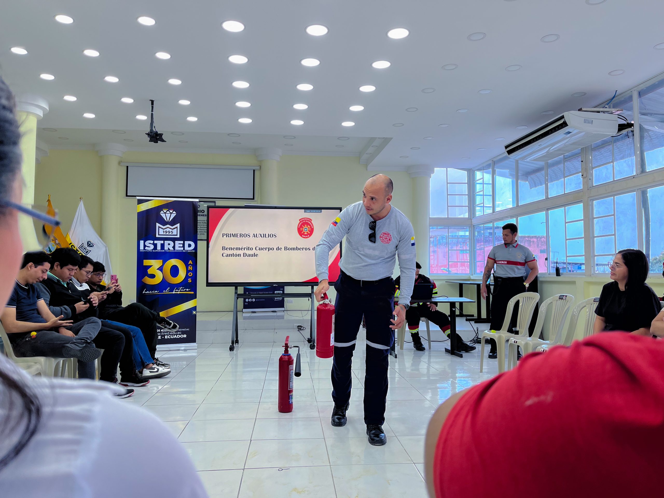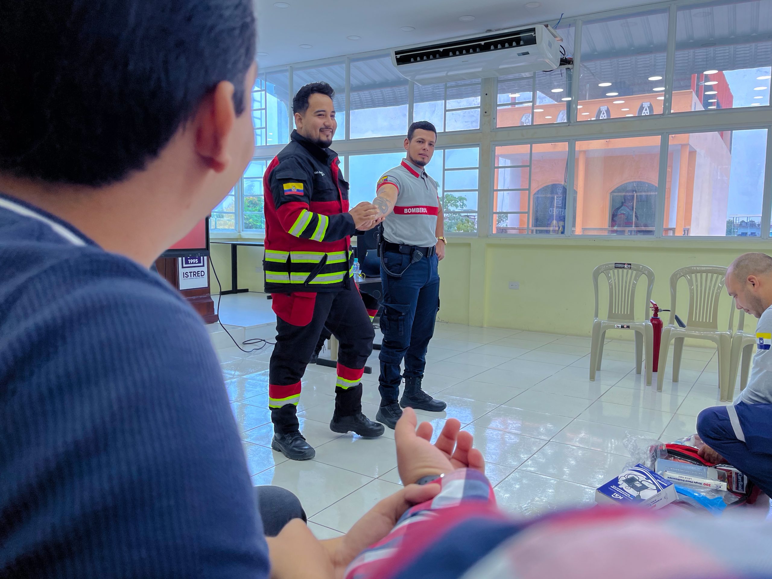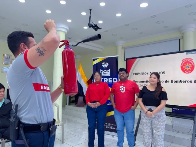 La capacitaci贸n cont贸 con la colaboraci贸n del Benem茅rito Cuerpo de Bomberos del cant贸n Daule, quienes aportaron su experiencia y conocimientos en temas de seguridad.