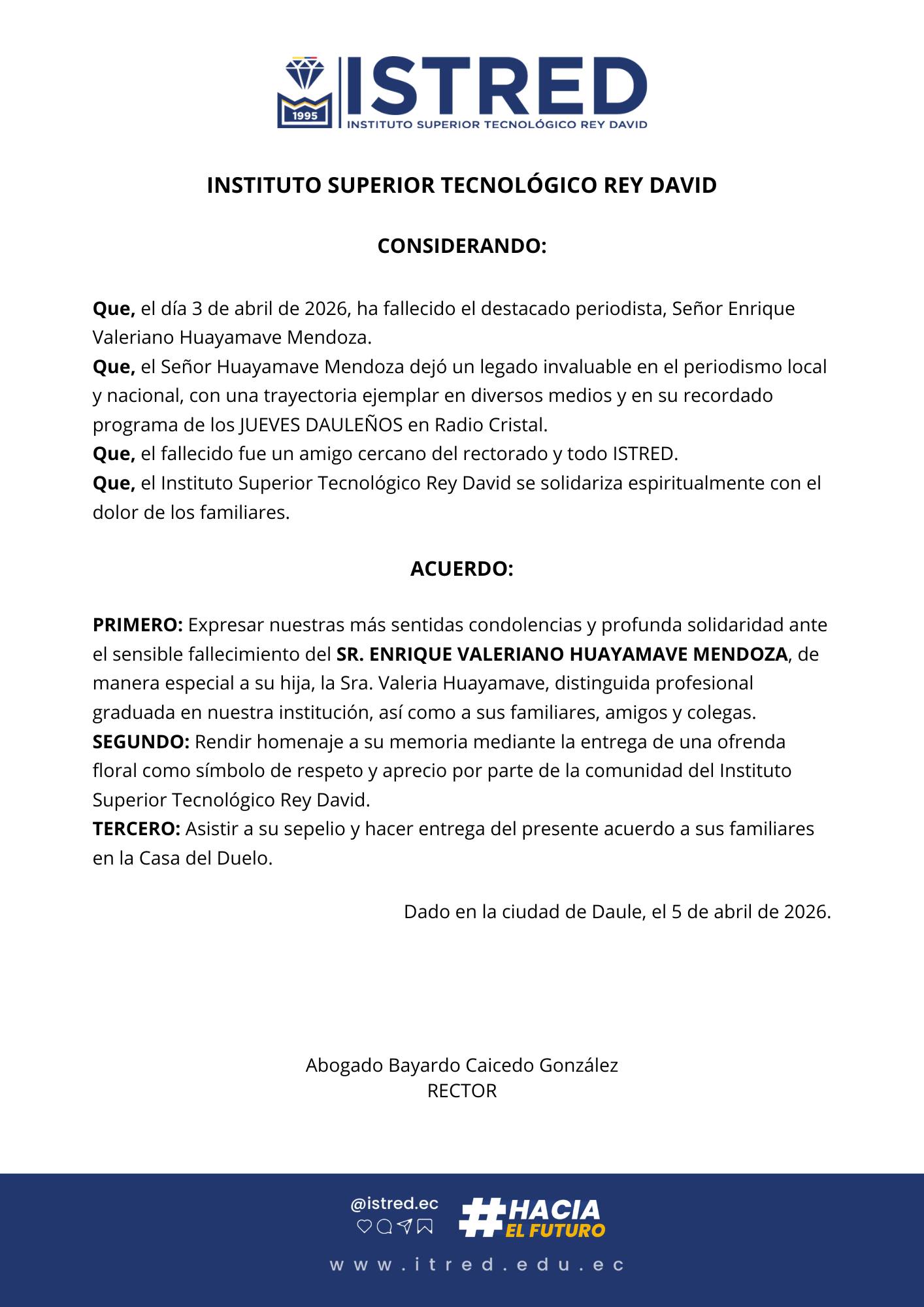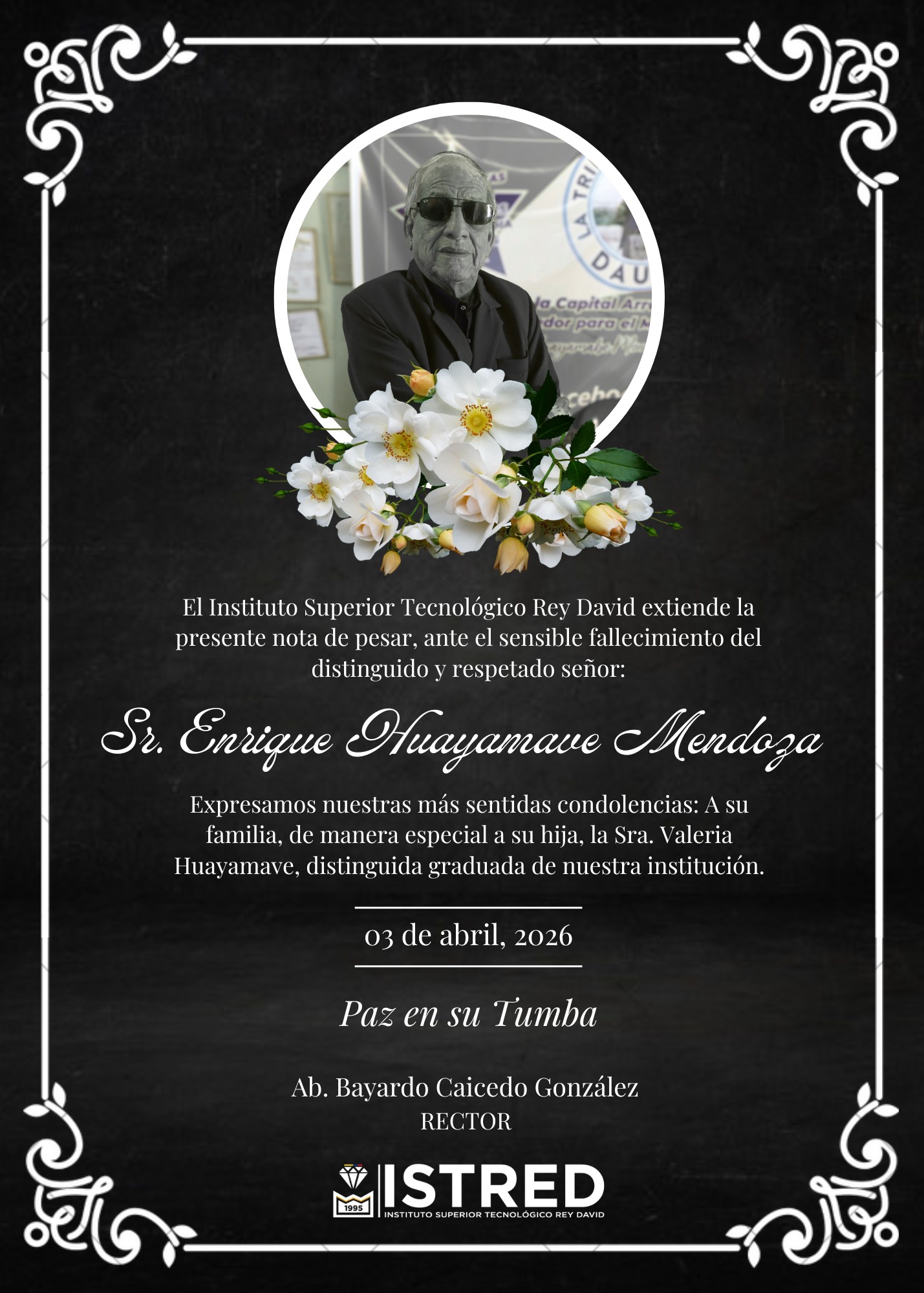 🕊️ Nota de Duelo El Instituto Superior Tecnológico Rey David expresa su profundo pesar ante el sensible fallecimiento del: SR. ENRIQUE VALERIANO HUAYAMAVE MENDOZA Reconocido periodista y entrañable amigo de nuestra institución, cuyo legado en el periodismo nacional perdurará en nuestra memoria. 🙏 Expresamos nuestras más sentidas condolencias A sus familiares, amigos y colegas en […]