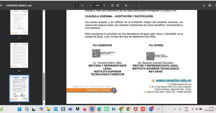 El Instituto Superior Tecnológico Rey David y el Instituto Superior Tecnológico CENESTUR de Quito firmaron el Convenio Marco y el Convenio de Movilidad Académica, el pasado 23 de septiembre de 2025. 📚 Con este acuerdo se fortalecen las actividades de: