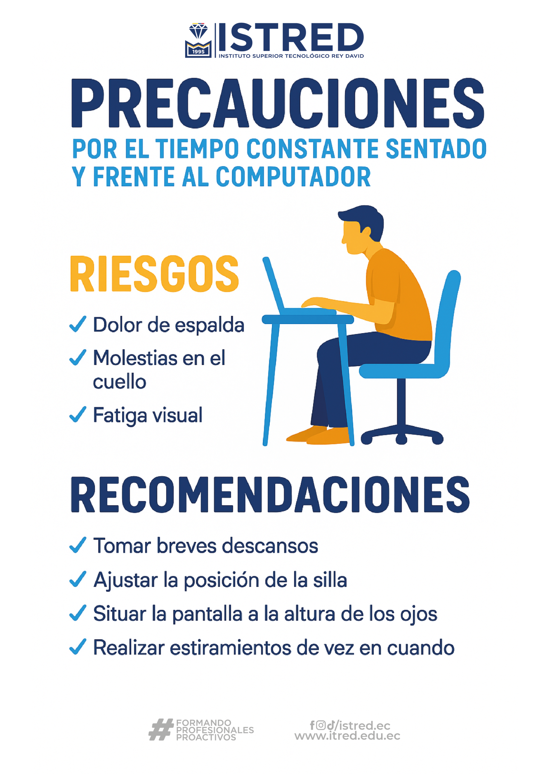 En esta imagen, el ISTRED alerta sobre los peligros de pasar largas horas sentado frente al computador sin una postura adecuada 馃鈥嶁檪锔忊潓馃獞. Dolor de espalda, cuello tenso y fatiga visual son solo algunos de los problemas que puedes evitar con peque帽os cambios en tu rutina 馃挕.
