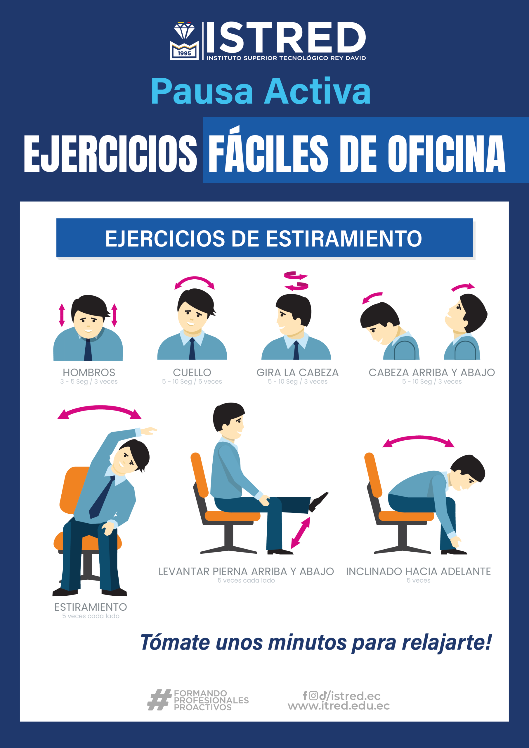 ISTRED muestra una serie de ejercicios de estiramiento fáciles y efectivos para realizar durante la jornada laboral 🧑💼. Cada postura ilustrada ayuda a aliviar tensiones musculares, mejorar la circulación y prevenir lesiones comunes por el sedentarismo o movimientos repetitivos.