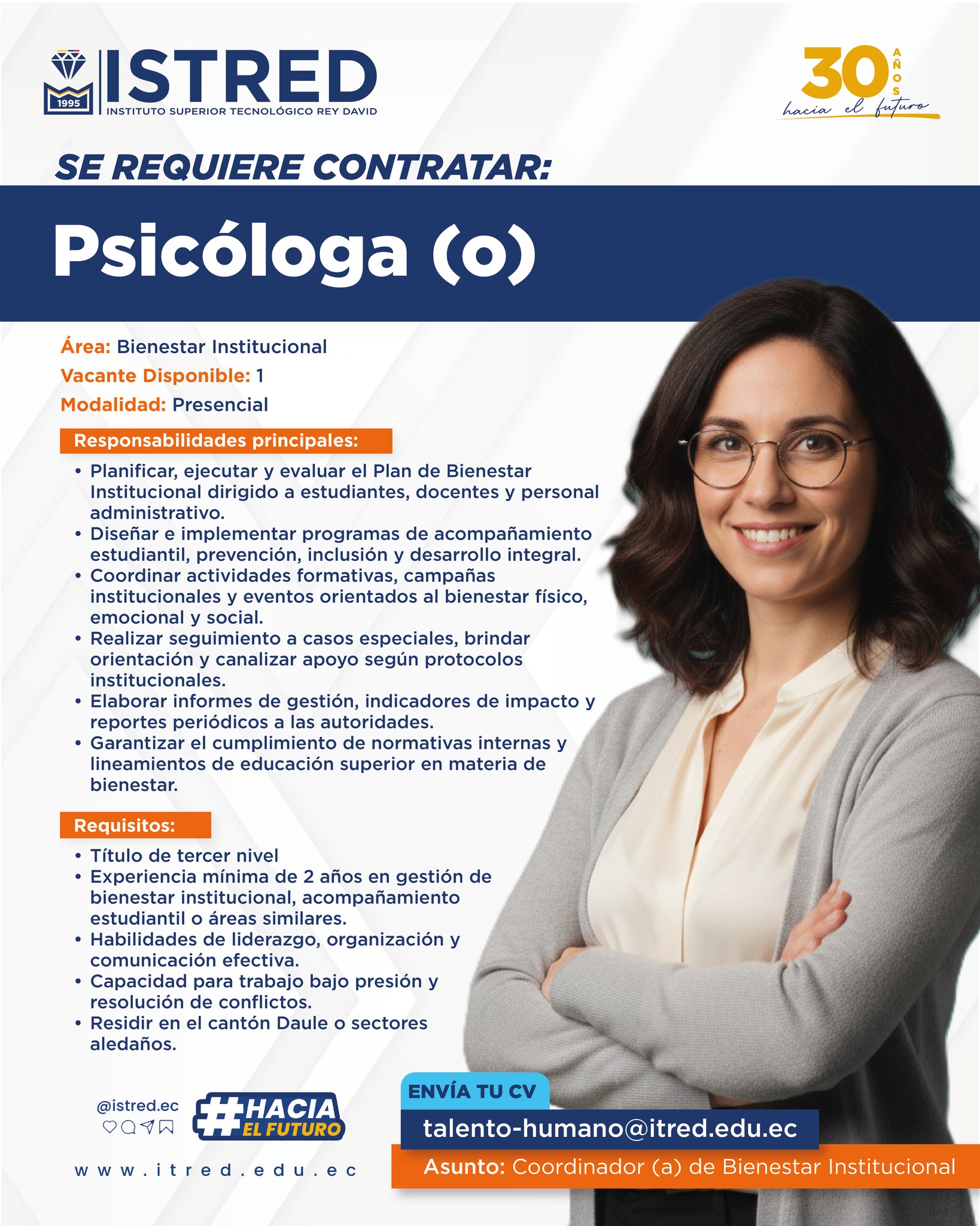 En ISTRED buscamos un(a) Psicólogo(a) para el área de Bienestar Institucional.