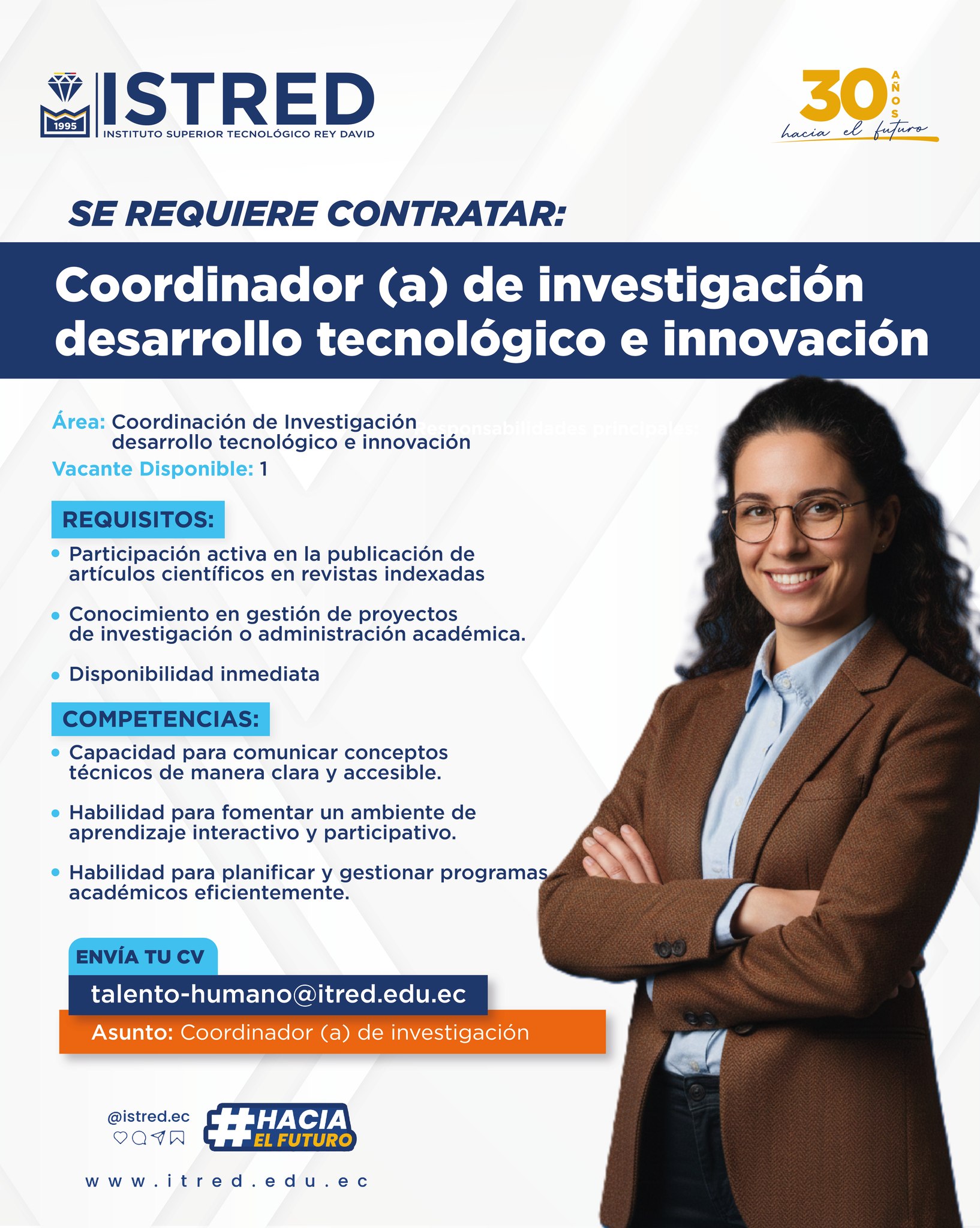 Buscamos un(a) profesional comprometido(a) con la investigación y la innovación para liderar nuestra Coordinación de Investigación, Desarrollo Tecnológico e Innovación.