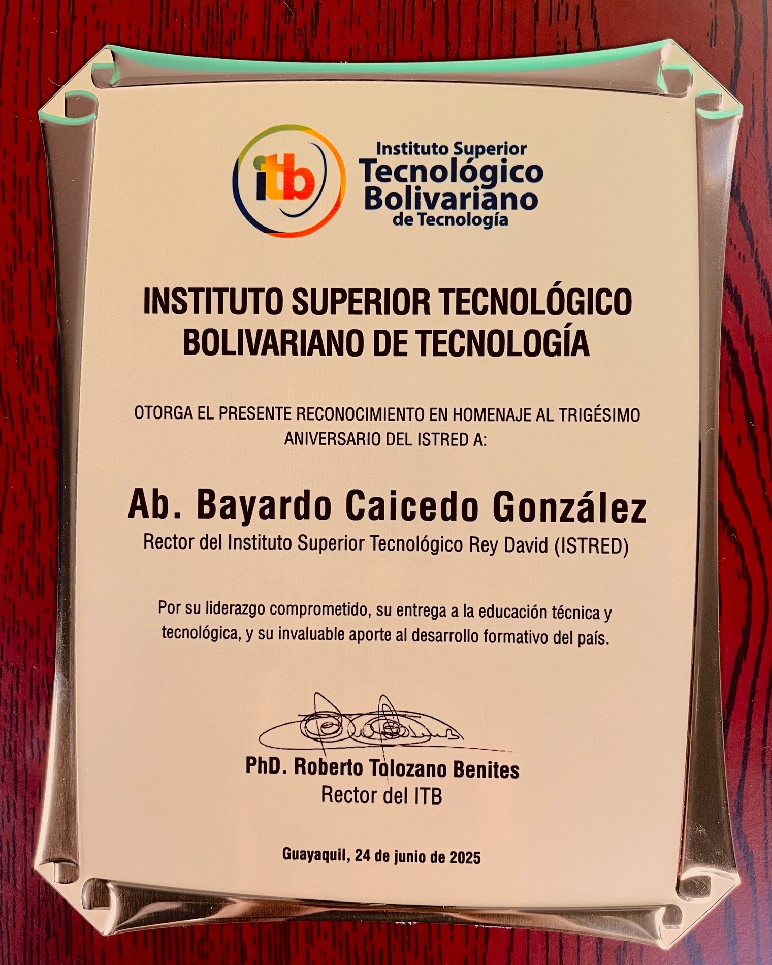 Con orgullo recibimos este reconocimiento del Instituto Superior Tecnológico Bolivariano de Tecnología, otorgado a nuestro rector, Ab. Bayardo Caicedo González, por su compromiso con la educación técnica y tecnológica, y su invaluable aporte al desarrollo formativo del país.