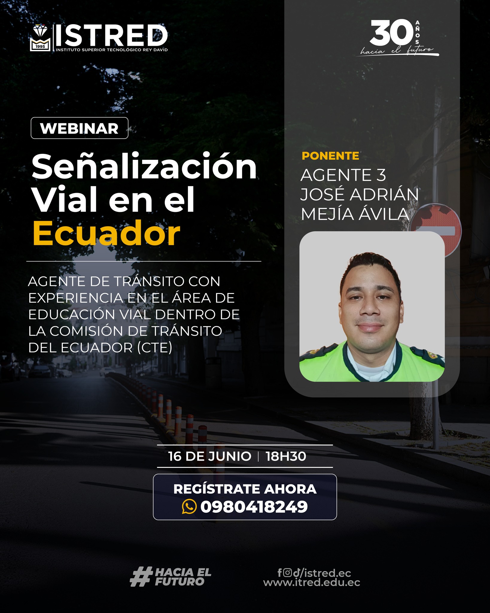 Participa en el webinar «Señalización Vial en el Ecuador», impartido por el Agente 3 José Adrián Mejía Ávila, experto en educación vial de la Comisión de Tránsito del Ecuador (CTE). Aprende sobre normativas, seguridad y buenas prácticas para una movilidad responsable.